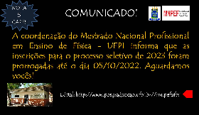 MNPEF-UFPI COORDENACAO DO PROGRAMA DE POS-GRADUACAO EM ENSINO DE FISICA - MESTRADO PROFISSIONAL UNIVERSIDADE FEDERAL DO PIAUÍ Telefone/Ramal: Não informado http://www.posgraduacao.ufpi.br//mnpefufpi