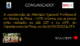 A coordenação do Mestrado Nacional Profissional em Ensino de Física - UFPI informa que as provas serão realizadas na sala 227 e no LIFE, do Departamento de Física, no dia 16/10/2022 às 13 h.