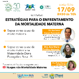 Acontece nesta sexta-feira (17), das 8:30 as 10 horas, no canal do Nuepes no YouTube, o webnário “Estratégias para o Enfrentamento da Mortalidade Materna”. O evento é organizado pelo Núcleo de Estudos, Pesquisa e Extensão em Educação Permanente para o SUS (NUEPES) da UFPI em parceria com a Universidade Aberta do SUS (Una-SUS/UFPI) e a Secretaria de Estado da Saúde (SESAPI).
