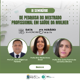 O Programa de Pós - Graduação em Saúde da Mulher da Universidade Federal do Piauí, promoverá entre os dias 02 a 05 de junho, a partir das 14hs,  o 3º Seminário de Pesquisa do Mestrado Profissional em Saúde da Mulher. O evento acontecerá presencialmente no prédio do Centro de Ciências da Saúde 2, antiga PREXC e tem por objetivo apresentar, avaliar e debater as propostas de Projetos de Pesquisa dos discentes do Programa.