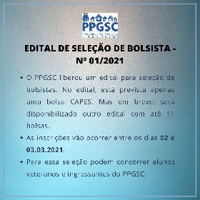 O PPGSC divulga seleção de bolsista, conforme normas estabelecidas no Edital N. 01/2021.