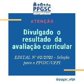 O Programa de Pós-Graduação em Saúde e Comunidade divulga o resultado da Etapa IV (currículo), referente ao processo seletivo regido pelo edital N.º 02/2021 - PPGSC/UFPI.