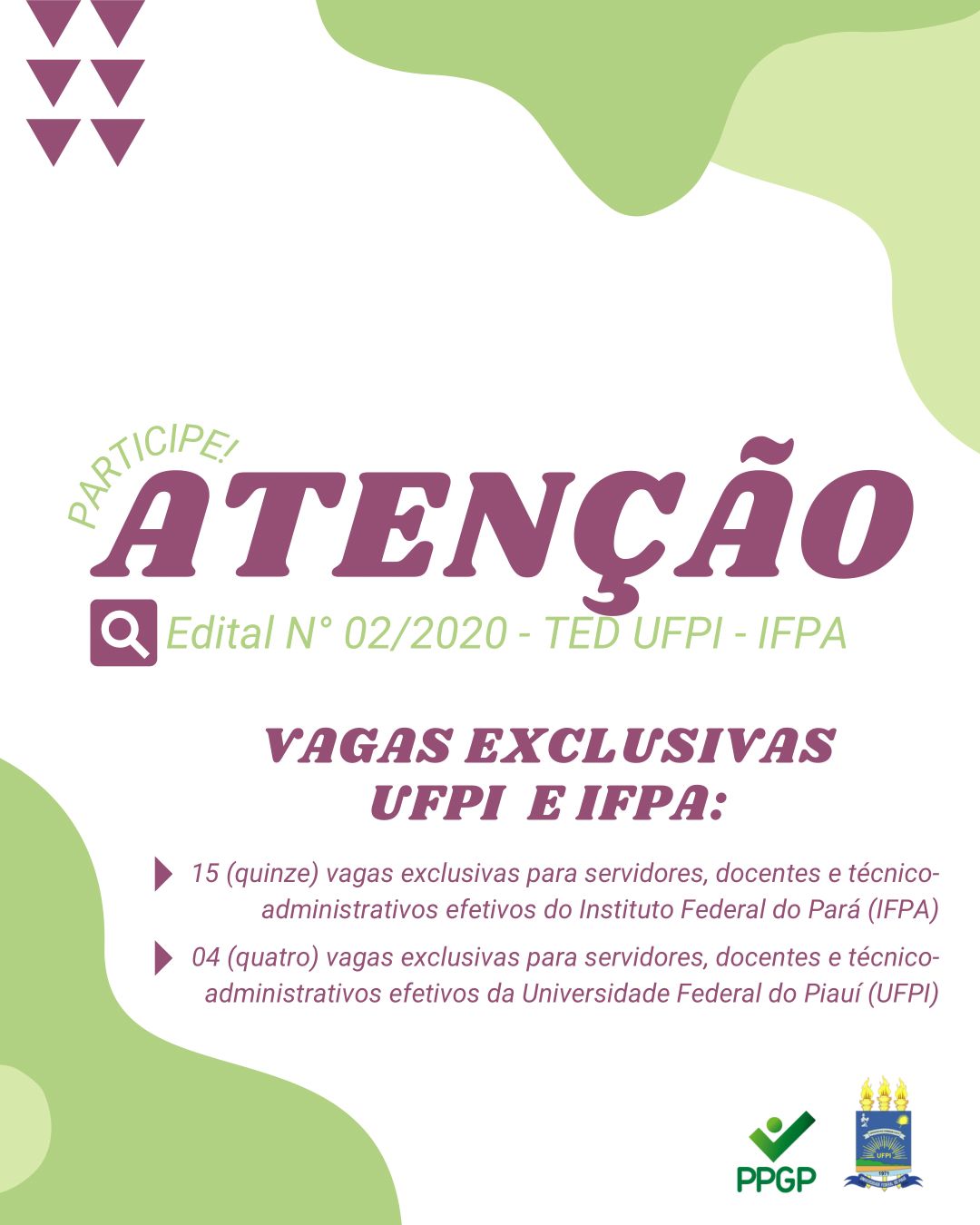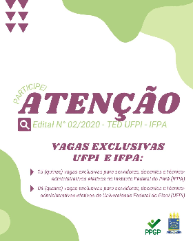 ATENÇÃO: As vagas do Edital n° 02/2021 são destinadas aos servidores docentes e técnicos administrativos efetivos do Instituto Federal de Educação, Ciência e Tecnologia do Pará- IFPA e da Universidade Federal do Piauí- UFPI.
