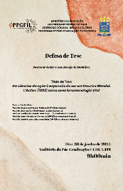 Temos a satisfação de convidar todas e todos para a primeira defesa de tese de doutorado do PPGFIL/UFPI. Trata-se da tese " DA CIÊNCIA DA AÇÃO À EXPANSÃO DO SER EM MAURICE BLONDEL: L’Action (1893) como uma fenomenologia vital", do doutorando Emerson Araújo de Medeiros. A banda será composta pelos professores doutores Gustavo Silvano Batista (UFPI/Orientador), Delmar Araujo Cardoso (UNICAP/Examinador Externo), Judikael Castelo Branco (UFT/Examinador Externo), José Ricardo Barbosa Dias (UFPI/Examinador Interno) e José Vanderlei Carneiro (UFPI/Examinador Interno).