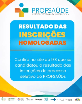 A Universidade Federal do Delta do Parnaíba (UFDPar), por meio do Programa de Pós-Graduação em Saúde da Família - PROFSAÚDE/UFDPar, torna público os resultados das inscrições do Edital de Seleção – Turma 6. O período de recursos das inscrições é 23/03/2026 e 24/03/2026, até as 23h:59min do último dia. Maiores informações do recurso, vide item 9 do edital. O recurso deverá ser enviado ao e-mail  .