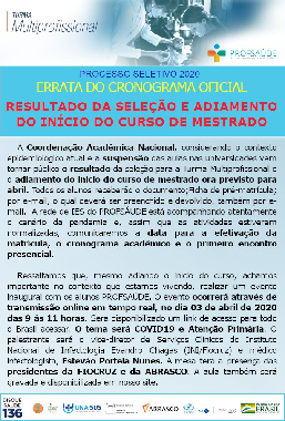 A Uiversidade Federal do Piauí (UFPI), por meio do Programa de Mestrado Profissional em Saúde da Família (PROSAÙDE/UFPI), torna públicos a ERRATA DO CRONOGRAMA GERAL e o RESULTADO DA CHAMADA PÚBLICA - Turma Multiprofissional.