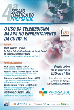 O Programa de Pós-Graduação em Saúde da Família - Mestrado Profissional - PROFSAÚDE, convida a comunidade acadêmica para a Quarta Sessão Temática da Rede PROFSAÚDE com a temática "O uso da telemedicina na APS no enfrentamento da COVID-19". O evento online ocorrerá no dia 06 de novembro no horário 9:30h - 11:30h no canal da Fundação Oswaldo Cruz (FIOCRUZ) no Youtube.
